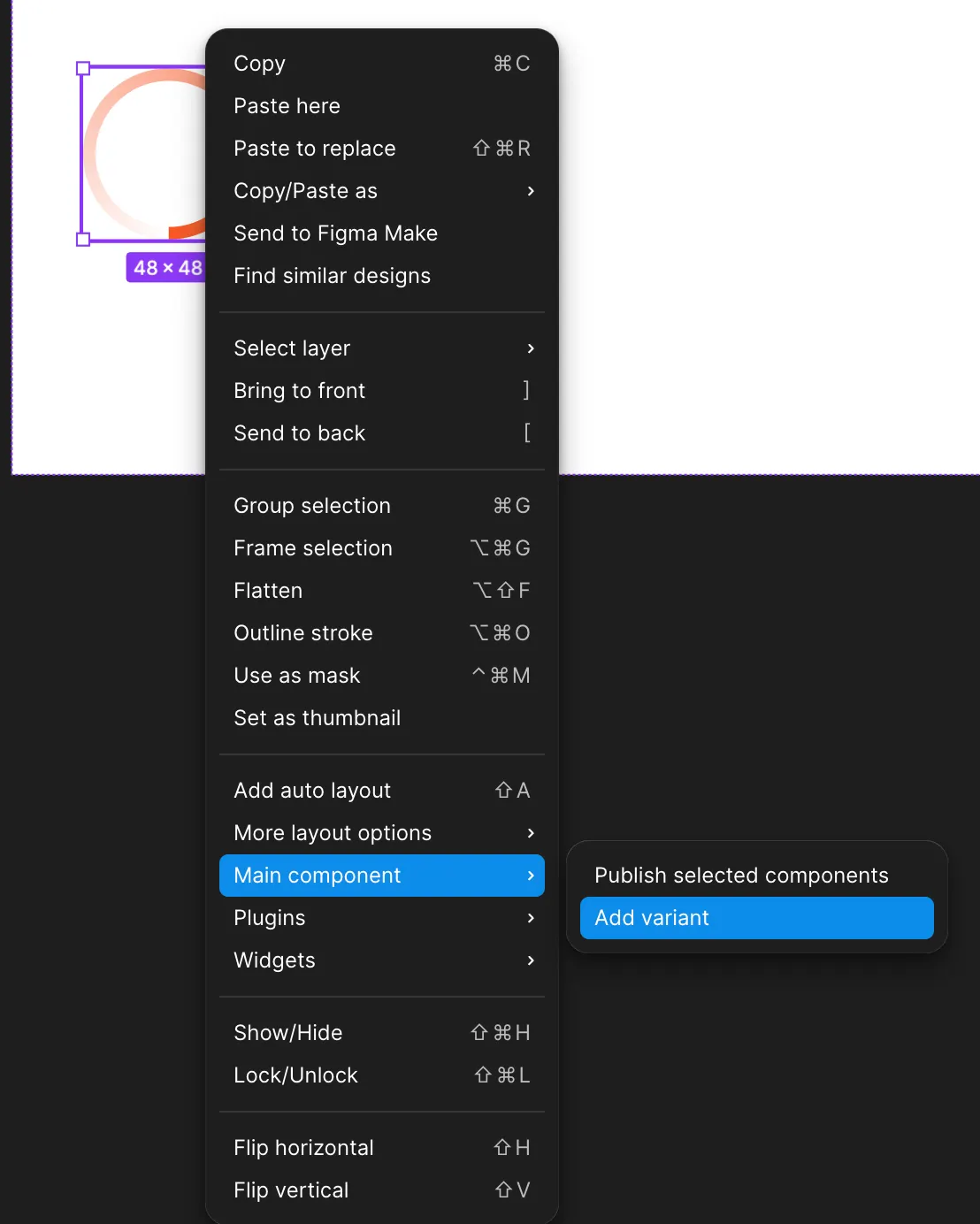 - 그 다음에 오른쪽 마우스를 다시 눌러 Main Component 메뉴로가서 Add variant를 3번 누릅니다.