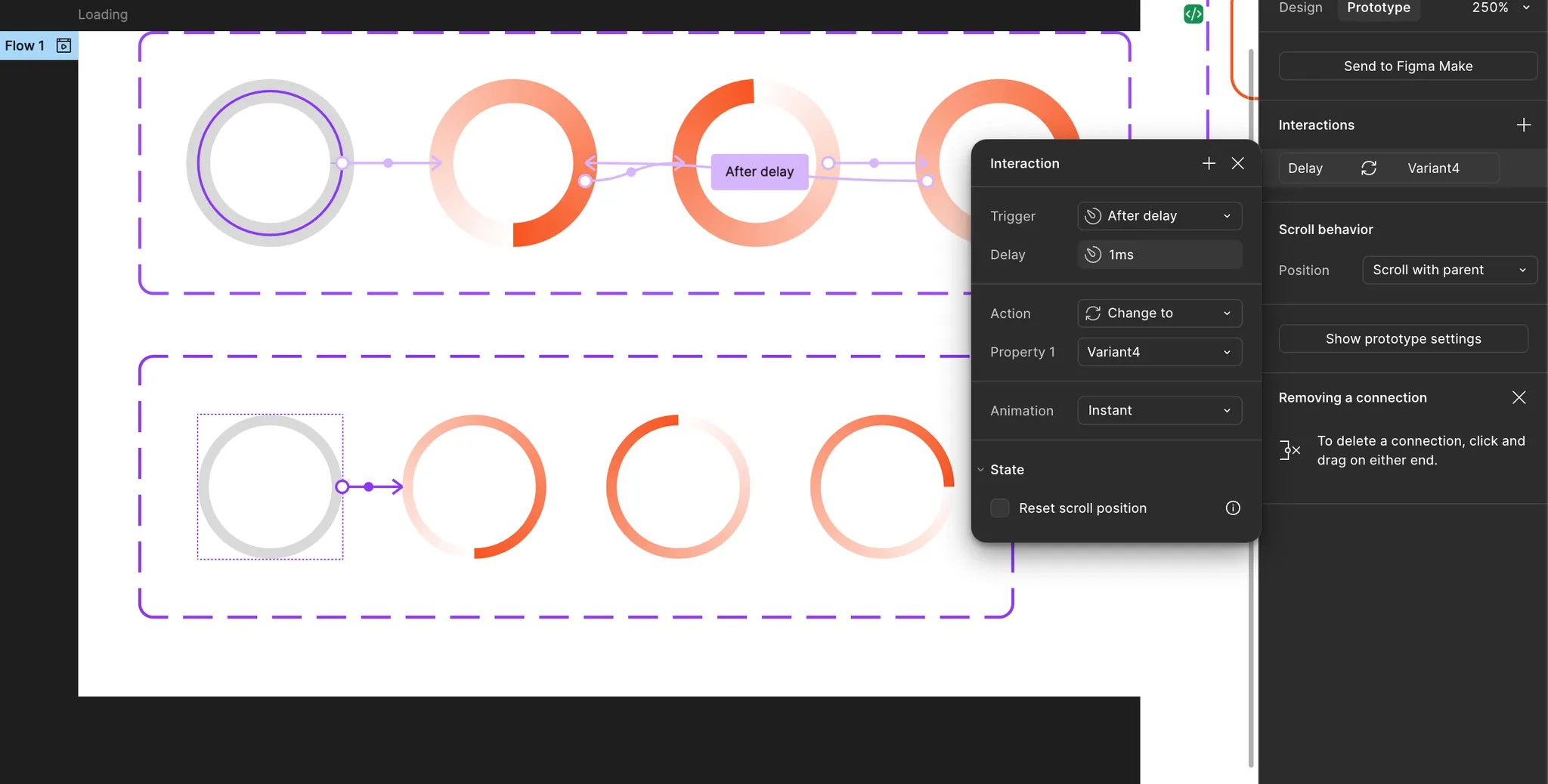 - 이제 애니메이션을 입힙니다. 1번 Varient를 선택하고 Prototype으로 이동하여 Interactions를 추가하고 Tigger는 After Dely, Delay는 1ms, Action은 Change to에 2번째 원 Varient4로 합니다.